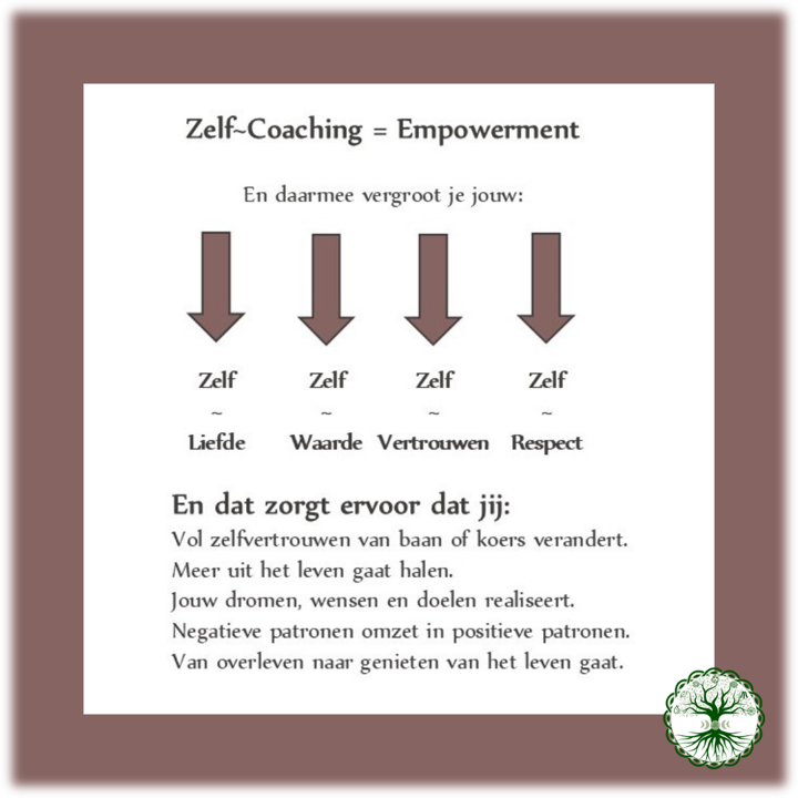 Op het moment dat jij in staat bent om jezelf te coachen vanuit jouw zelfhelend vermogen, dan ga je jouw Zelf~Liefde, Zelf~Waarde, Zelf~Vertrouwen en Zelf~Respect vergroten. En dat zorgt ervoor dat je keuzes gaat maken die ervoor zorgen dat je het leven gaat leiden waar je gelukkig van wordt. Je hebt de regie (weer) terug over je leven. Je gaat van overleven naar genieten van het leven.